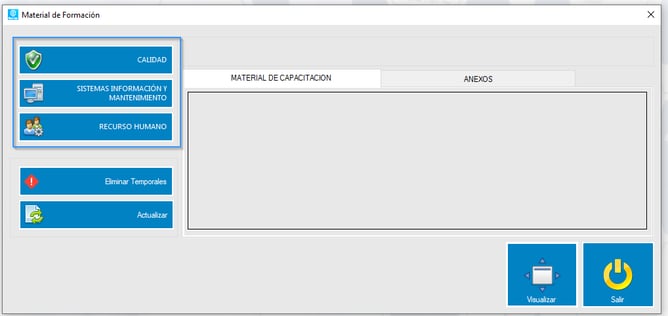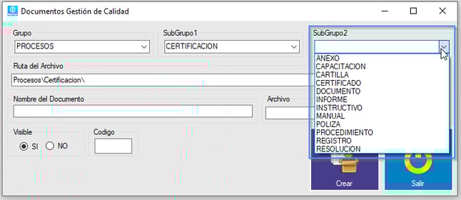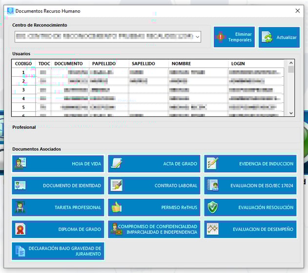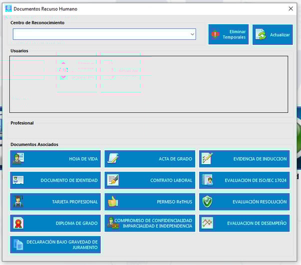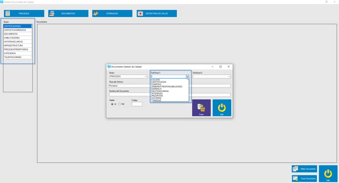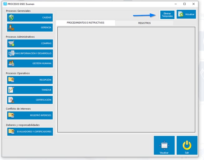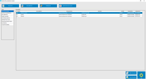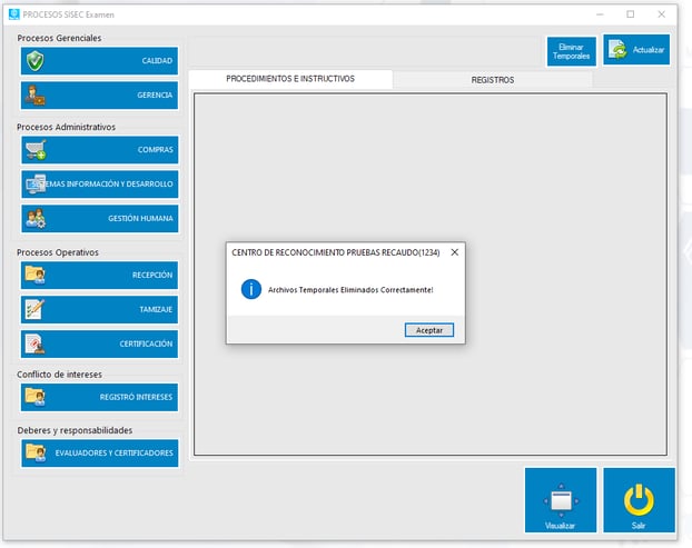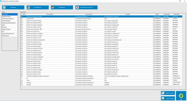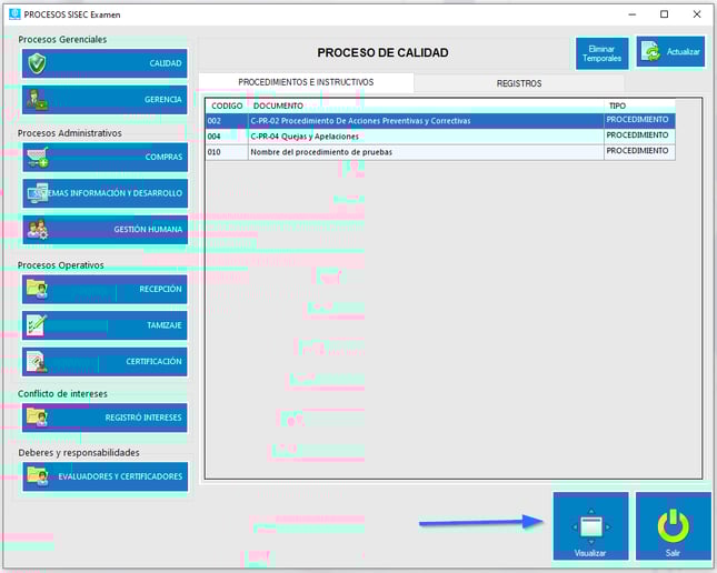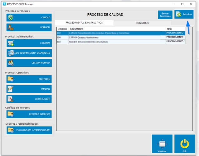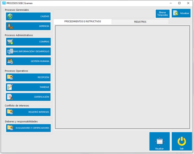 Los procesos, procedimientos, instructivos y registros (formatos) que podemos encontrar en esta funcionalidad son los siguientes: Calidad, Gerencia, Compras, Sistemas de Información y Desarrollo, Gestión Humana, Recepción, Tamizaje, Certificación, Registros de Intereses, Evaluadores y Certificadores.