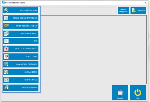 Los documentos que acreditan al CRC los podemos encontrar en la parte izquierda de la pantalla: Acreditación ONAC, Resolución MinTransporte, Poliza de Responsabilidad, Cámara de Comercio, Rut, Hab. Secretaria de Salud, Sisec Examen, Manuales de Operación, Baremaciones, Cronogramas y Auditoría Interna.