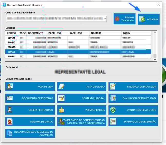 la tabla ubicada arriba se actualiza según lo que fue consultado.Funcionalidad Hojas de Vida