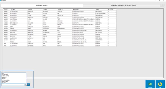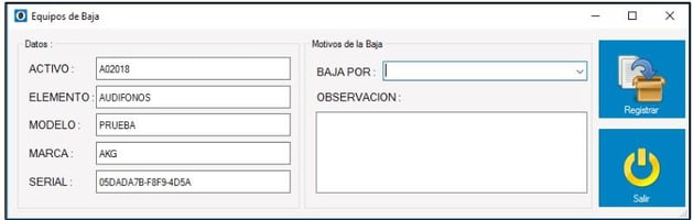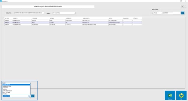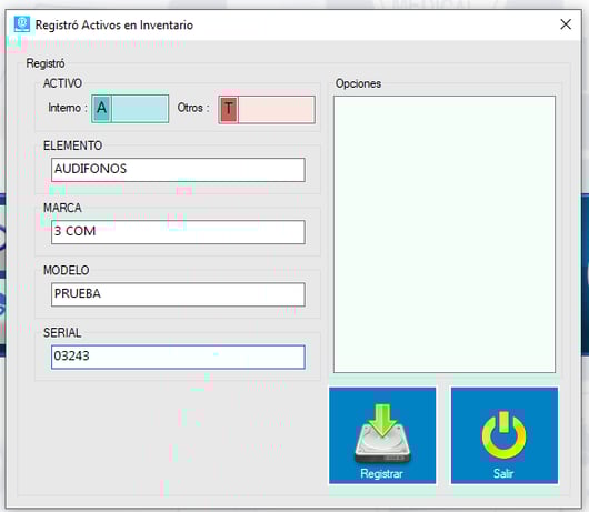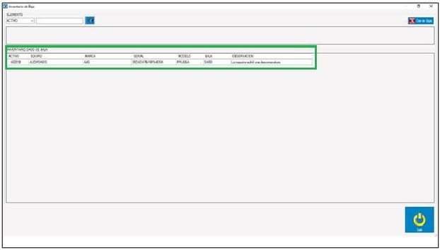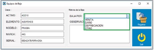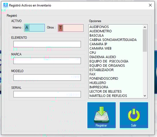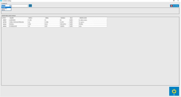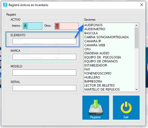 - Se escribe el número del activo, se hace clic en el cuadro de texto con el nombre de “Elemento”, seguido aparece a la derecha en el cuadro de opciones los posibles tipos de equipos que se puede seleccionar.