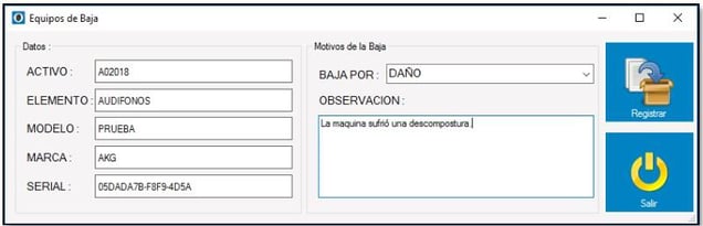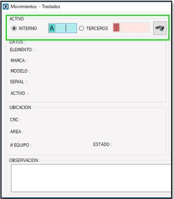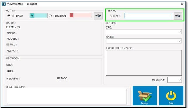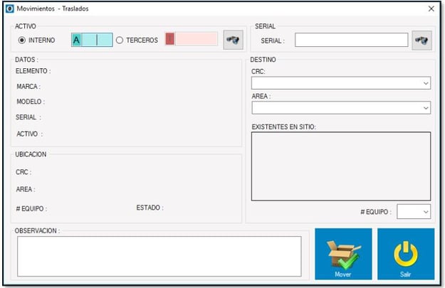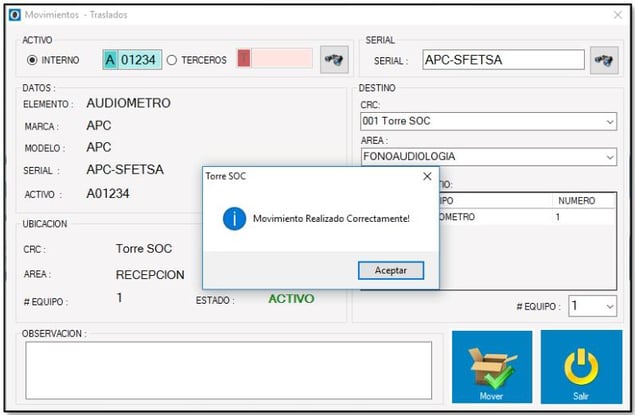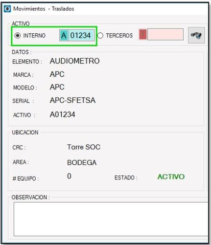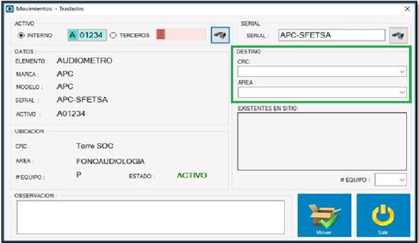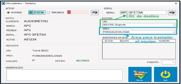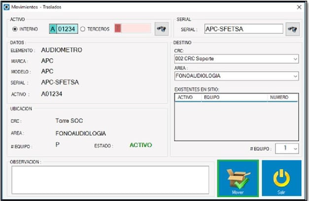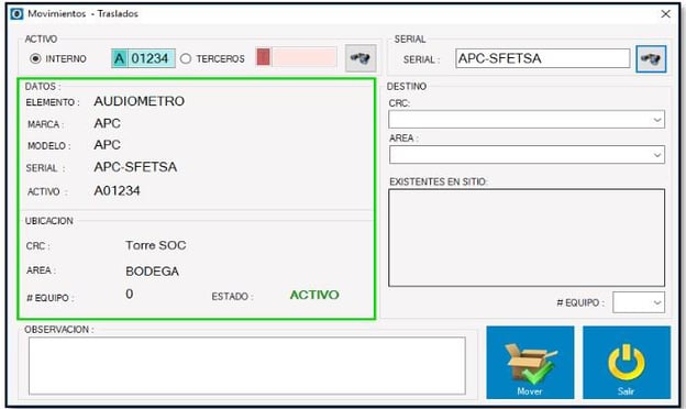 se visualiza automáticamente información detallada sobre el equipo que se desea trasladar.
