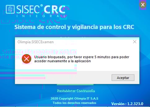 Al registrar erróneamente la contraseña del usuario por más de tres veces, se presenta un mensaje informativo indicando que el usuario estará bloqueado por 5 minutos. Pasado los cinco minutos el usuario de nuevo podrá intentar acceder al aplicativo con credenciales válidas y correctas.