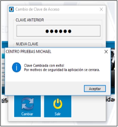 SISEC® muestra un mensaje informando que la contraseña ha sido cambiada con éxito y la aplicación se cierra por motivos de seguridad.