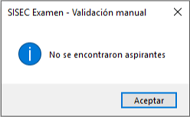 En caso de que no se encuentre ningún aspirante registrado del día actual se mostrará un mensaje informando que no se encontraron aspirantes