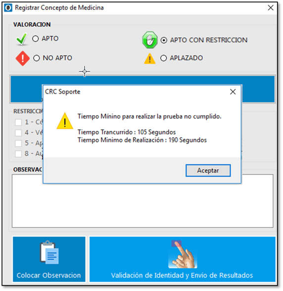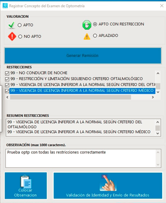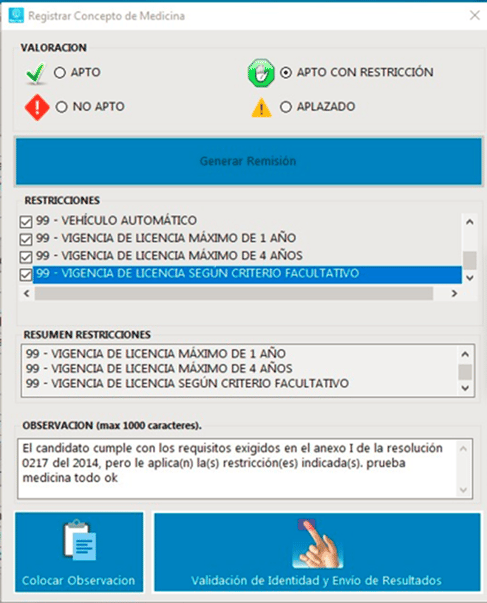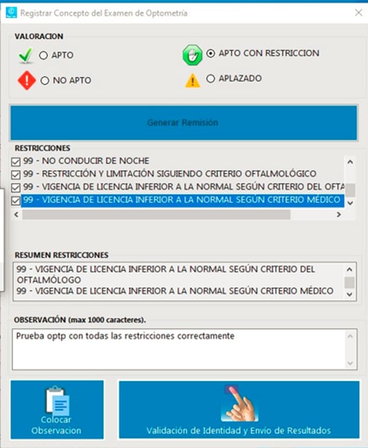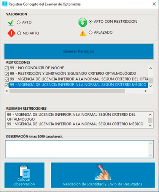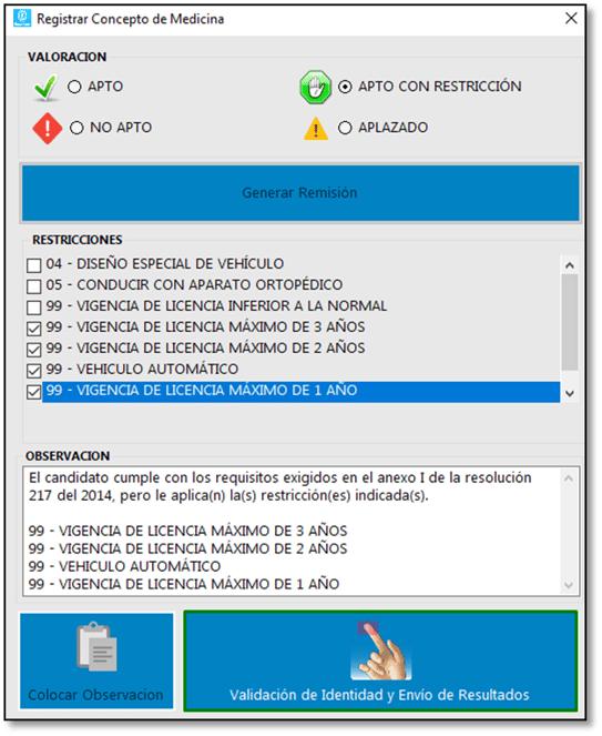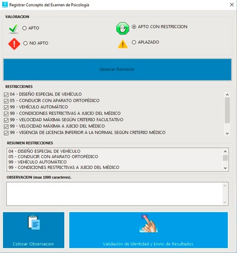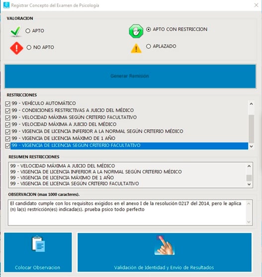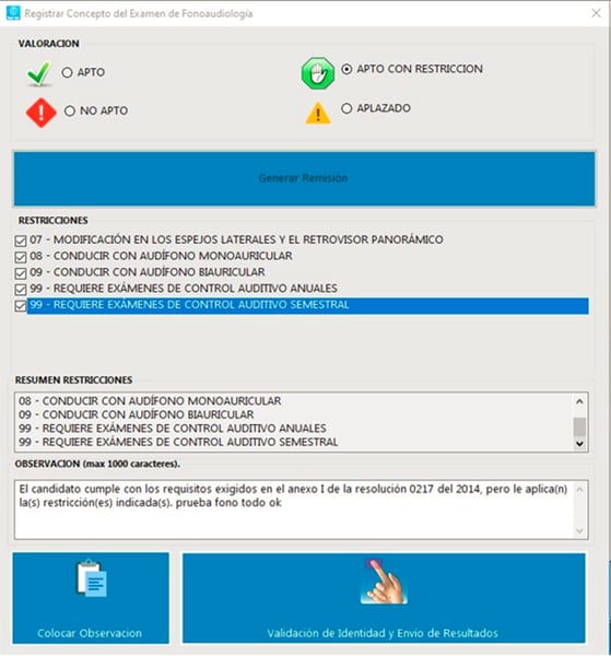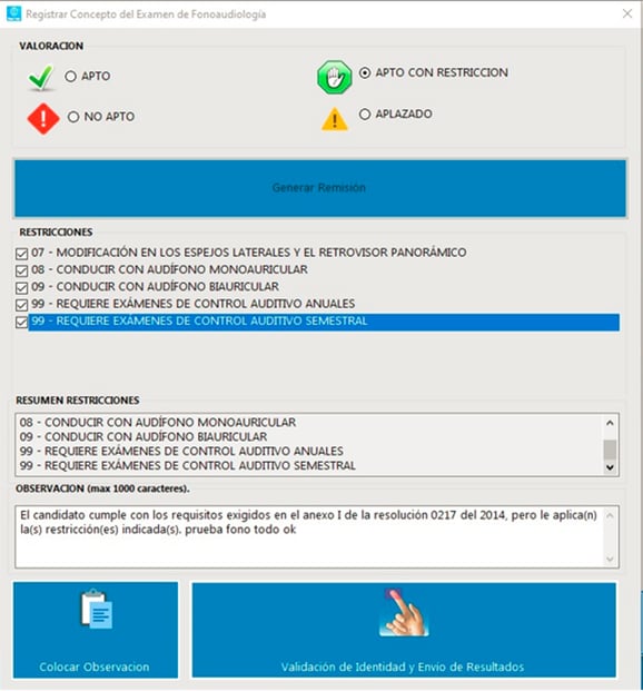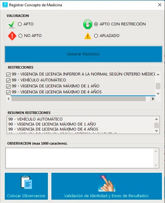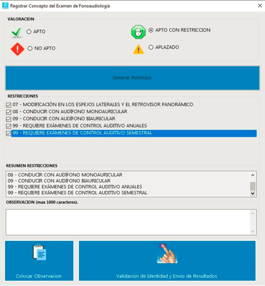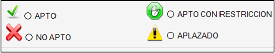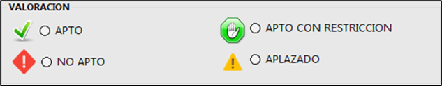 En caso de seleccionar la valoración “APTO CON RESTRICCION” se muestra en pantalla las posibles restricciones: