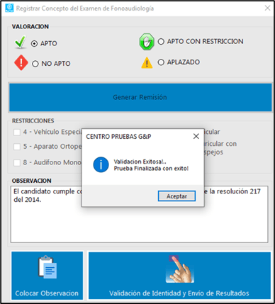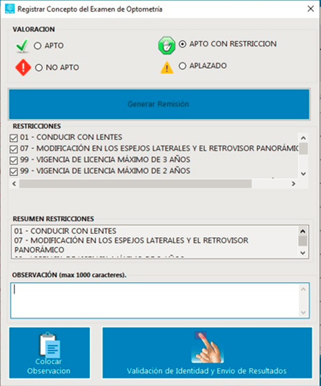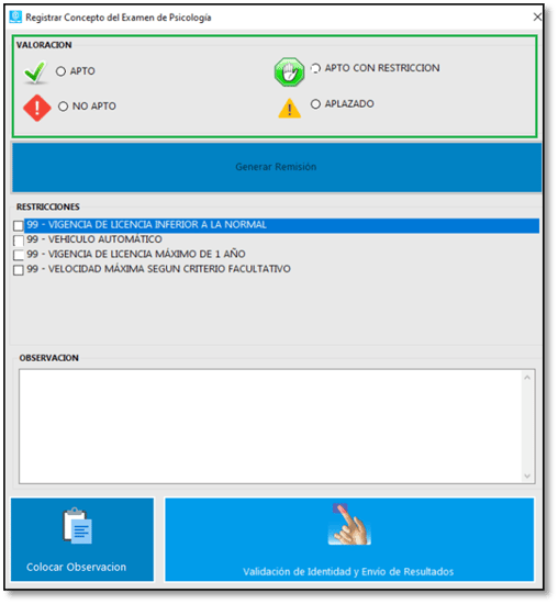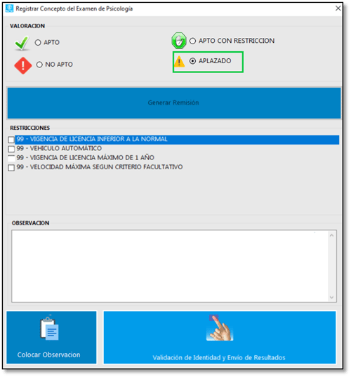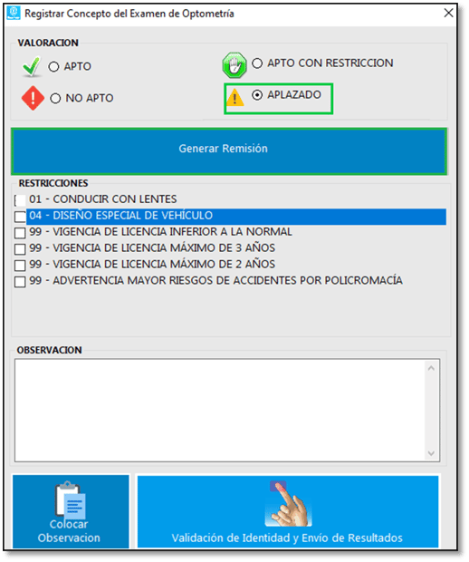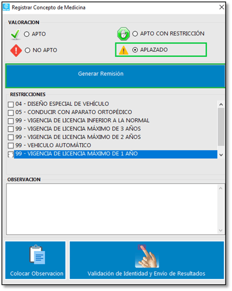 Todas las especialidades cuentan con el sistema de “Generar Remisión”, que se activa cuando el especialista selecciona la valoración “APLAZADO”, y consite en indicar en la ventana la observación y/o condición que tiene que ser subsanada para dar una valoración definitiva: