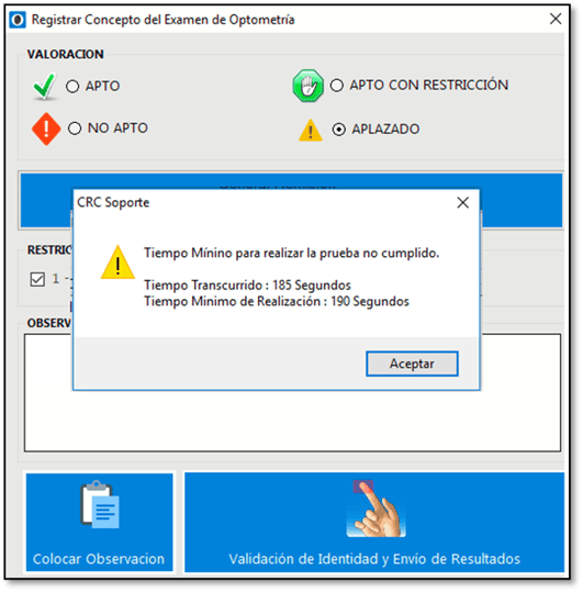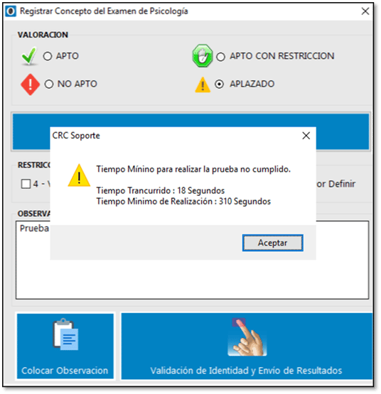 Al seleccionar un aspirante con el dictamen de validación aplazado, la aplicación no permite realizar las 4 pruebas médicas, al realizar la certificación el sistema genera un mensaje de advertencia que el aspirante se encuentra aplazado.