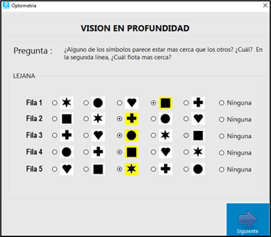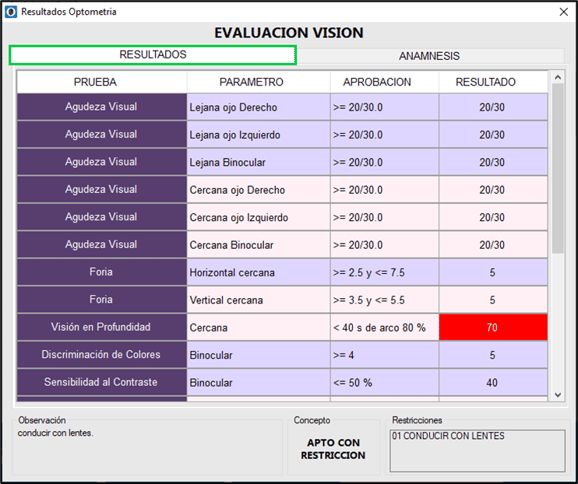 En la consulta de resultados de Optometría podrá ver las respuestas de Anamnesis y resultado de la prueba médica.