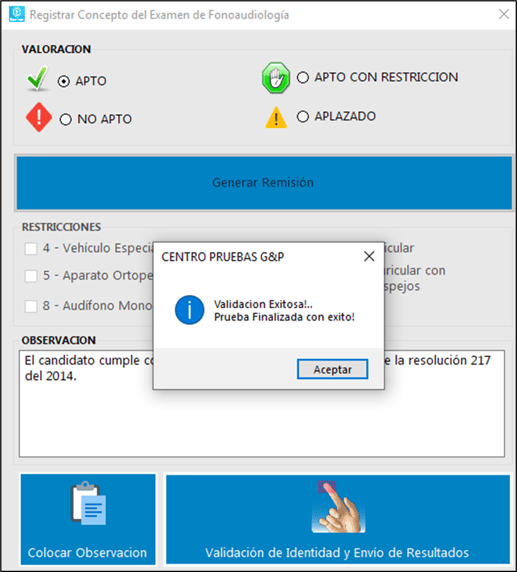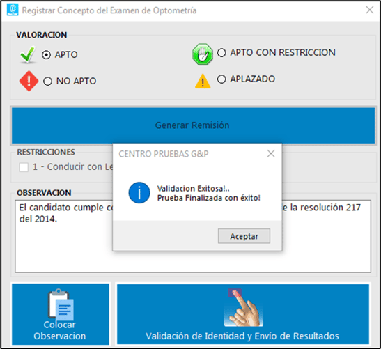 El sistema pide nuevamente las huellas del Aspirante y del Especialista, Muestra un mensaje informando que la Validación ha sido finalizada con éxito.