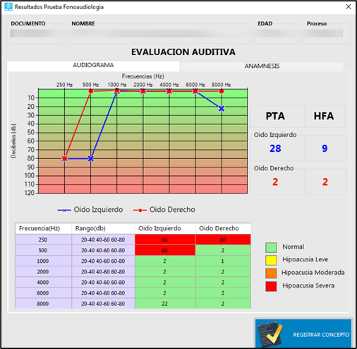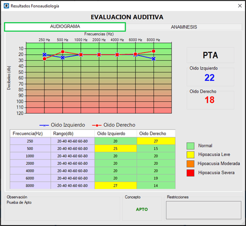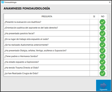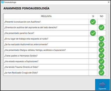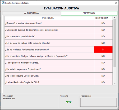 En la consulta de resultados de Fonoaudiología podrá ver las respuestas de Anamnesis y resultado de la prueba médica.
