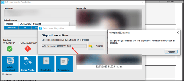 - En caso de que se cierre la ventana de la prueba médica se podrán recuperar los resultados eligiendo el mismo dispositivo al iniciar la prueba nuevamente, la aplicación mostrará un mensaje indicando que la prueba ya fue realizada con el dispositivo: