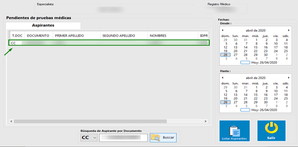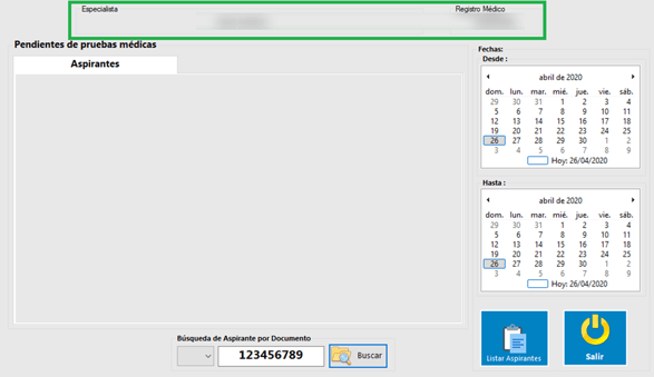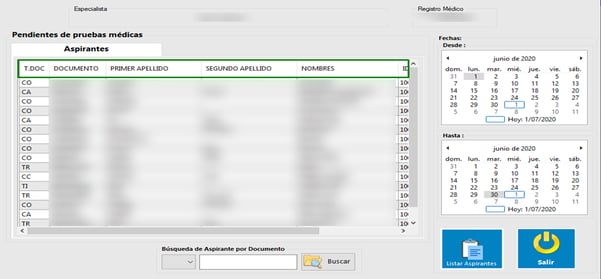 Se podrá consultar los aspirantes que tienen pendiente la prueba médica por tipo y número de documento.