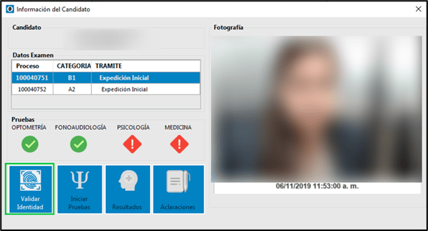 Para validar la identidad del aspirante y del especialista es necesario seguir los siguientes pasos: Después de hacer clic en el botón “Validar Identidad” se muestra una ventana donde el especialista y el aspirante deben validar su identidad.