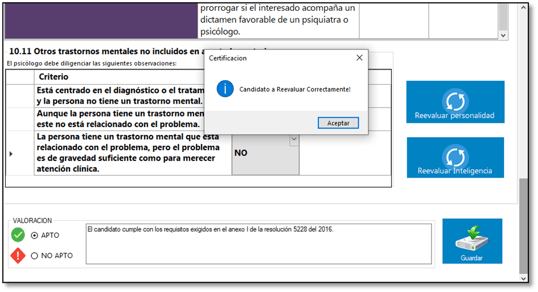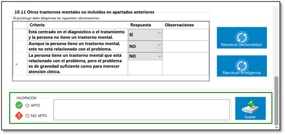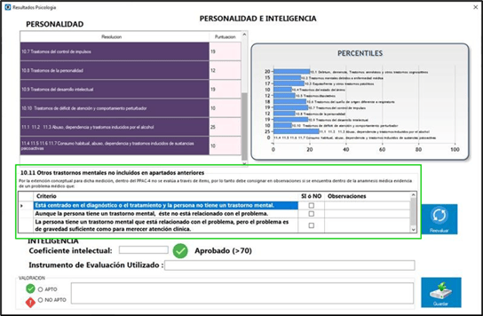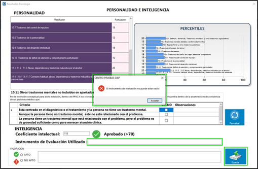 El campo de observación se visualizará en blanco para que allí el especialista registre el resultado obtenido en la prueba por el aspirante. Este campo es obligatorio para finalizar la prueba de Psicología.