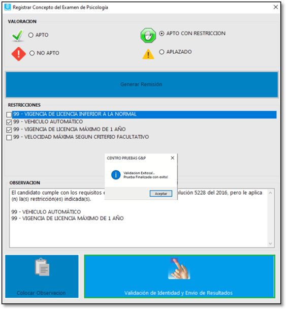 Para finalizar la prueba de psicología a es necesario dar clic en el botón “Validación de identidad y Envío de resultados”.