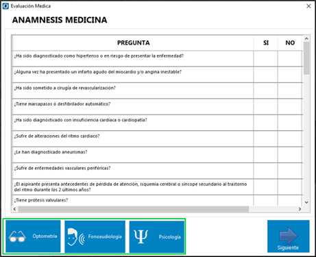Al iniciar la prueba de medicina general se presenta el cuestionario de Anamnesis en el cual es posible genera la consulta de los resultados de las demás pruebas ya registradas.